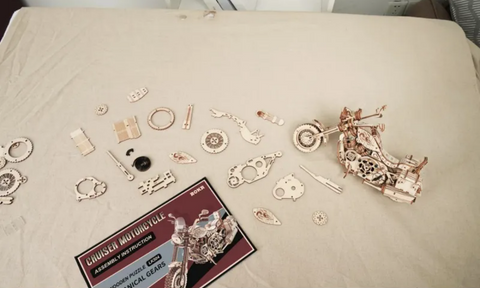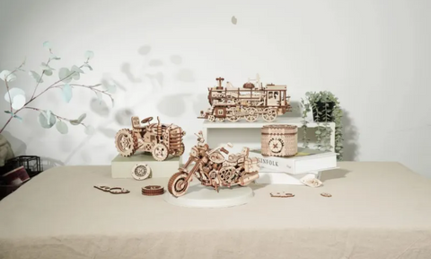 Inspired by 1920s cruiser motorcycles, this detailed 3D wooden model lets you assemble a moving classic from 420 laser-cut pieces—no glue required, just pure mechanical satisfaction.