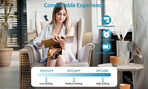 Built-in rechargeable battery and wireless design let you enjoy soothing knee relief on the couch, at your desk, or while traveling—no outlets or messy cords required.