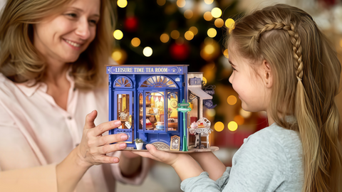 From navy storefront to floral wallpaper, sofas, pastries, and warm LEDs, the scene captures classic British tea time. It’s a mindful craft that becomes a glowing décor centerpiece.